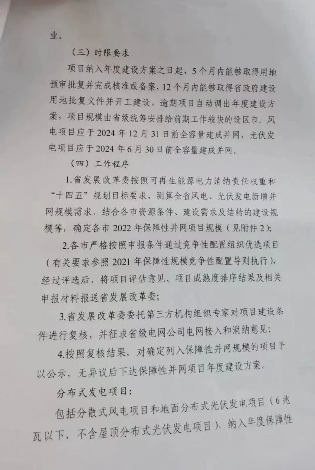 并網(wǎng)時(shí)限要求方面文件要求:保障性項(xiàng)目納入年度建設(shè)方案之日起,5個(gè)月內(nèi)能夠取得用地預(yù)審批復(fù)并完成核準(zhǔn)或備案,12個(gè)月內(nèi)能夠取得省政府建設(shè)用地批復(fù)文件并開工建設(shè),逾期項(xiàng)目自動調(diào)出年度建設(shè)方案,項(xiàng)目規(guī)模由省級統(tǒng)籌安排給前期工作較快的設(shè)區(qū)市。風(fēng)電項(xiàng)目應(yīng)于2024年12月31日前全容量建成并網(wǎng),光伏發(fā)電項(xiàng)目應(yīng)于2024年6月30日前全容量建成并網(wǎng)。