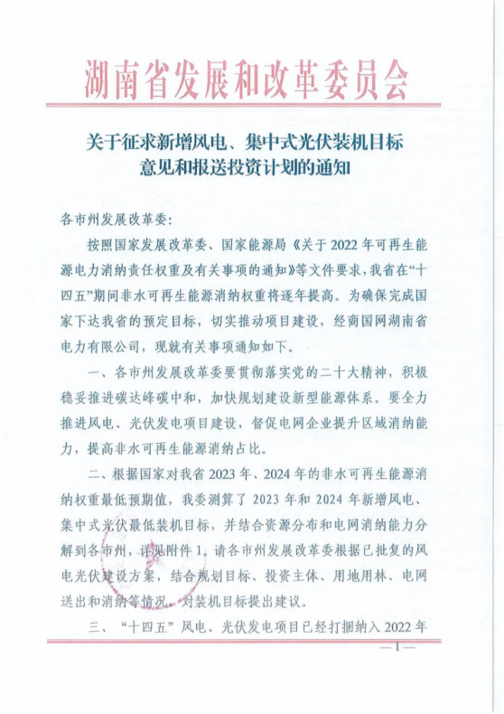 11月10日,湖南省發(fā)改委下發(fā)《關(guān)于征求新增風(fēng)電、集中式光伏裝機(jī)目標(biāo)意見和報(bào)送投資計(jì)劃的通知》?!锻ㄖ分赋?,根據(jù)國家對湖南省2023年、2024年的非水可再生能源消納權(quán)重最低預(yù)期值,湖南發(fā)改委測算了2023年和2024年新增風(fēng)電、集中式光伏最低裝機(jī)目標(biāo),并結(jié)合資源分布和電網(wǎng)消納能力分解到各市州。其中,2023年湖南新增風(fēng)電規(guī)模為225萬千瓦,新增光伏裝機(jī)規(guī)模為340萬千瓦;2024年湖南新增風(fēng)電規(guī)模為330萬千瓦,新增光伏裝機(jī)規(guī)模為300萬千瓦。