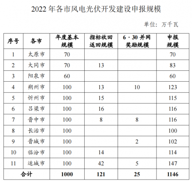 11月21日,山西省能源局發(fā)布了《2022年風電、光伏發(fā)電開發(fā)建設競爭性配置工作方案》(以下簡稱《方案》),明確指出,綜合考慮全省全社會用電量、外送電量、電網(wǎng)消納能力、可再生能源消納責任權重目標等因素,安排風電、光伏發(fā)電保障性并網(wǎng)年度規(guī)模1000萬千瓦,獎勵規(guī)模146萬千瓦。