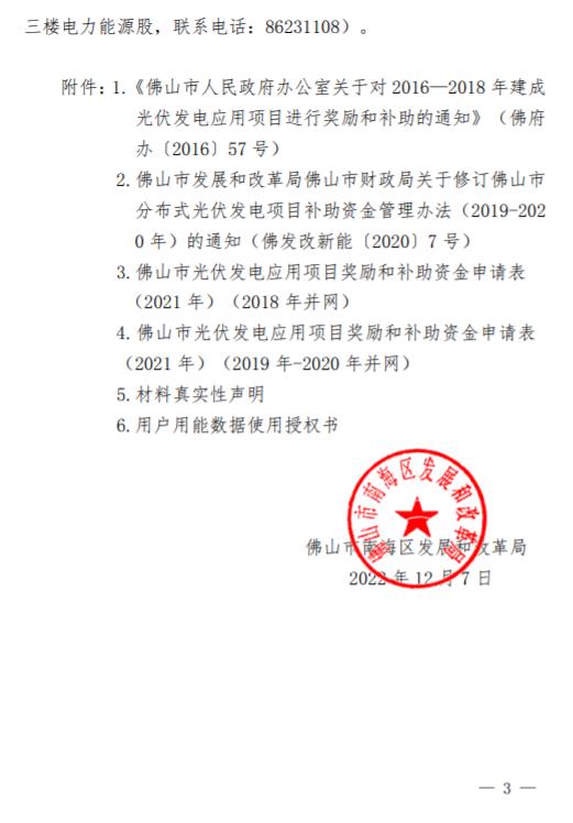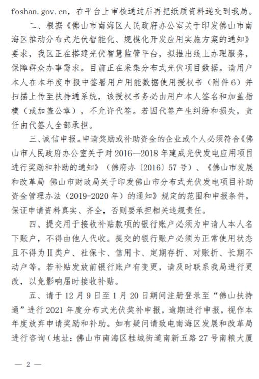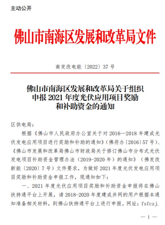 12月8日,廣東省佛山市南海區(qū)發(fā)改局發(fā)布《關(guān)于組織申報2021年度光伏應(yīng)用項(xiàng)目獎勵和補(bǔ)助資金的通知》,2021年度光伏應(yīng)用項(xiàng)目獎勵和補(bǔ)助資金申報將在佛山扶持通平臺上開展,請2018-2020年度建成并網(wǎng)的用戶根據(jù)本通知準(zhǔn)備相關(guān)材料,到佛山扶持通平臺上進(jìn)行申報。