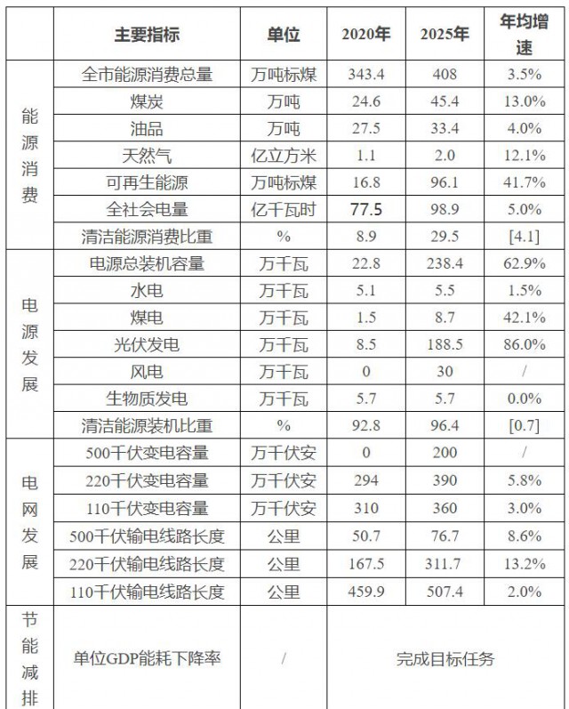 ——能源安全保障目標(biāo)。到2025年,電力裝機(jī)容量達(dá)238.4萬千瓦,清潔能源裝機(jī)容量達(dá)229.7萬千瓦,占電力總裝機(jī)容量的96.4%;新增110千伏以上輸電線路210公里以上,新增變電容量346萬千伏安;完善城市天然氣管網(wǎng)建設(shè),新建江南門站、高中壓調(diào)壓站2座,新建次高壓管網(wǎng)16公里、中壓管網(wǎng)370公里以上。