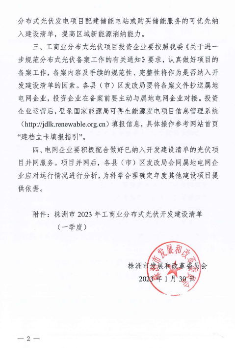 1月31日,湖南省株洲市發(fā)展和改革委員會(huì)發(fā)布了株洲市2023年工商業(yè)分布式光伏開(kāi)發(fā)建設(shè)清單(一季度)的通知。通知指出,各縣(市)區(qū)要加強(qiáng)項(xiàng)目指導(dǎo)、監(jiān)督和管理,確保項(xiàng)目按時(shí)建成并網(wǎng)。對(duì)于逾期6個(gè)月仍未并網(wǎng)的項(xiàng)目,將調(diào)出建設(shè)清單。