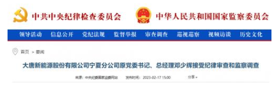 中央紀委國家監(jiān)委網(wǎng)站2月17日消息,據(jù)中國大唐集團有限公司紀檢監(jiān)察組、寧夏回族自治區(qū)監(jiān)察委員會消息:大唐新能源股份有限公司寧夏分公司原黨委書記、總經(jīng)理鄧少輝涉嫌嚴重違紀違法,目前正接受中國大唐集團有限公司紀檢監(jiān)察組紀律審查和寧夏回族自治區(qū)銀川市監(jiān)察委員會監(jiān)察調(diào)查。