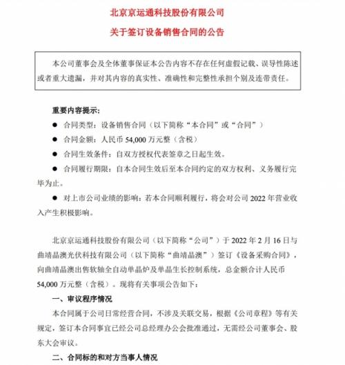2月17日,京運通(601908.SH)公告稱,公司于2022年2月16日與曲靖晶澳簽訂《設備采購合同》,向曲靖晶澳出售軟軸全自動單晶爐及單晶生長控制系統(tǒng),總金額合計5.4億元(含稅)。