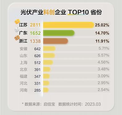光伏產(chǎn)業(yè)技術(shù)迭代速度迅猛,屬于科技含量較高的成長(zhǎng)性行業(yè),啟信寶產(chǎn)業(yè)鏈數(shù)據(jù)庫(kù)從企業(yè)技術(shù)創(chuàng)新、科創(chuàng)資質(zhì)、研發(fā)實(shí)力、企業(yè)成長(zhǎng)性以及行業(yè)潛力5個(gè)維度對(duì)光伏企業(yè)進(jìn)行科創(chuàng)能力“掃描”后發(fā)現(xiàn),光伏產(chǎn)業(yè)鏈中,科創(chuàng)企業(yè)主要集中在江蘇、廣東、浙江三省,三省的科創(chuàng)企業(yè)數(shù)量約為2800家、1600家、1300家左右,分別占比25.02%、14.70%以及11.91%。江蘇成“存續(xù)企業(yè)”“科創(chuàng)企業(yè)”數(shù)量雙料榜首。
