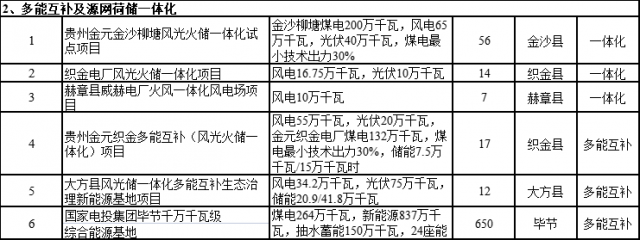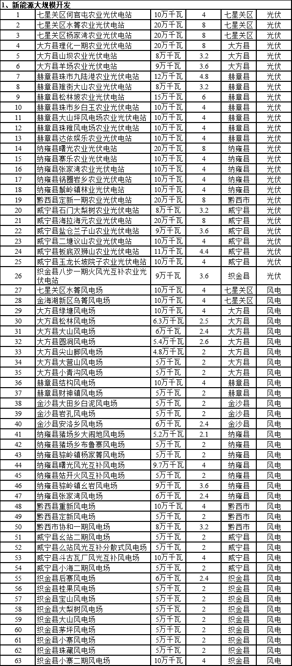 根據(jù)畢節(jié)市新型綜合能源基地建設(shè)重點項目表來看,涉及光伏、風(fēng)電、風(fēng)光制氫以及多能互補與源網(wǎng)荷儲一體化多個項目。其中光伏項目約26個,規(guī)模為3.19GW,風(fēng)電項目為37個,規(guī)模為2.374GW。多能互補以及源網(wǎng)荷儲項目為6個,規(guī)模為11.62GW,光伏1.45GW,風(fēng)電為1.8GW。其中,國家電投集團(tuán)畢節(jié)千萬千瓦級綜合能源基地新能源規(guī)劃規(guī)模為8.37GW。