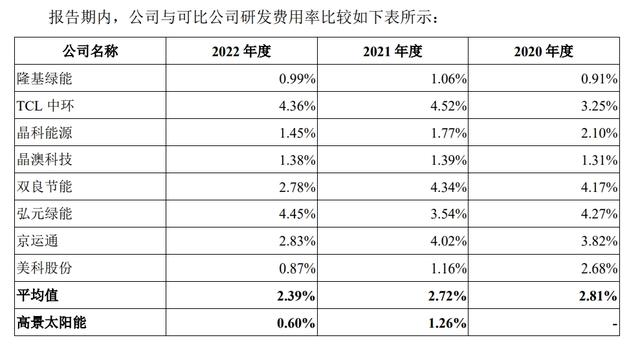 但高景太陽能與同行相比,研發(fā)投入占營收比例較低。招股書數(shù)據(jù)顯示,2020年,高景太陽能未發(fā)生研發(fā)費(fèi)用。2021-2022年,高景太陽能研發(fā)費(fèi)用分別約3143.15萬元、1.06億元,占當(dāng)期營收比重僅為1.26%和0.6%。作為光伏產(chǎn)業(yè)鏈企業(yè),研發(fā)費(fèi)用過低或?qū)⒂绊懝竞罄m(xù)經(jīng)營潛力。