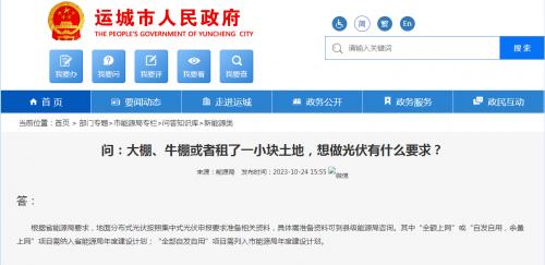 日前有群眾在運(yùn)城市能源局官網(wǎng)詢問大棚、牛棚或者租了一小塊土地,想做光伏有什么要求?運(yùn)城市能源局官方回復(fù):根據(jù)省能源局要求,地面分布式光伏按照集中式光伏申報(bào)要求準(zhǔn)備相關(guān)資料,具體需準(zhǔn)備資料可到縣級能源局咨詢。其中“全額上網(wǎng)”或“自發(fā)自用,余量上網(wǎng)”項(xiàng)目需納入省能源局年度建設(shè)計(jì)劃;“全部自發(fā)自用”項(xiàng)目需列入市能源局年度建設(shè)計(jì)劃。