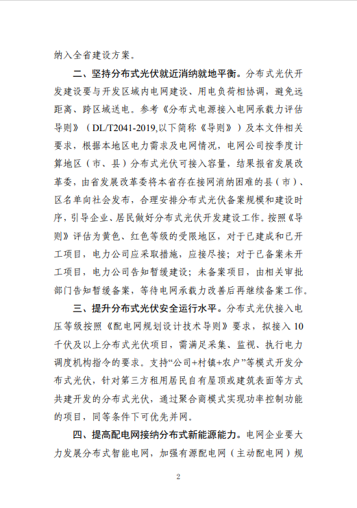 文件提出,加強地方指導及監(jiān)督工作。各市能源主管部門應統(tǒng)籌推進分布式光伏開發(fā)建設工作,結合發(fā)布的評估結果,在規(guī)劃制定、項目開發(fā)等環(huán)節(jié)積極引導分布式光伏合理布局、有序建設,促進源網(wǎng)協(xié)調發(fā)展。同時在建設開發(fā)分布式光伏項目過程中要嚴格備案管理,嚴厲打擊“光伏貸”、過度宣傳、承諾保障項目收益等侵害人民群眾合法權益行為,推動當?shù)胤植际焦夥】涤行虬l(fā)展。