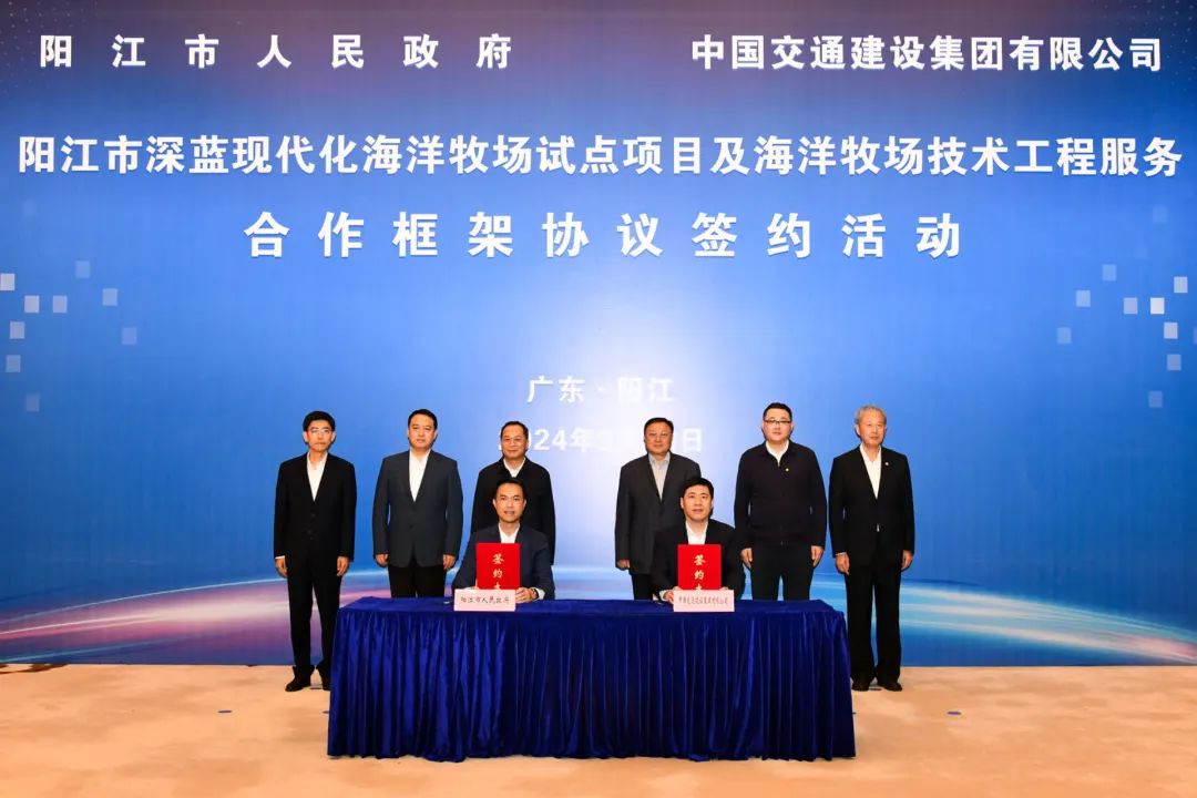 中交集團(tuán)黨委常委、副總經(jīng)理裴岷山與陽江市副市長關(guān)天表代表雙方簽署合作框架協(xié)議。根據(jù)協(xié)議,雙方將在海洋牧場試點(diǎn)項(xiàng)目及技術(shù)工程服務(wù)等方面開展務(wù)實(shí)合作。
