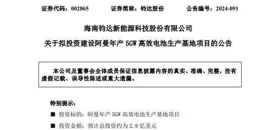 7月25日晚間,鈞達(dá)股份公告稱,公司擬于阿曼蘇丹國(guó)(下稱“阿曼”)投資建設(shè)5GW高效電池生產(chǎn)基地,該項(xiàng)目預(yù)計(jì)投資總額2.8億美元,項(xiàng)目建設(shè)周期約9個(gè)月,預(yù)計(jì)2025年建成投產(chǎn)。