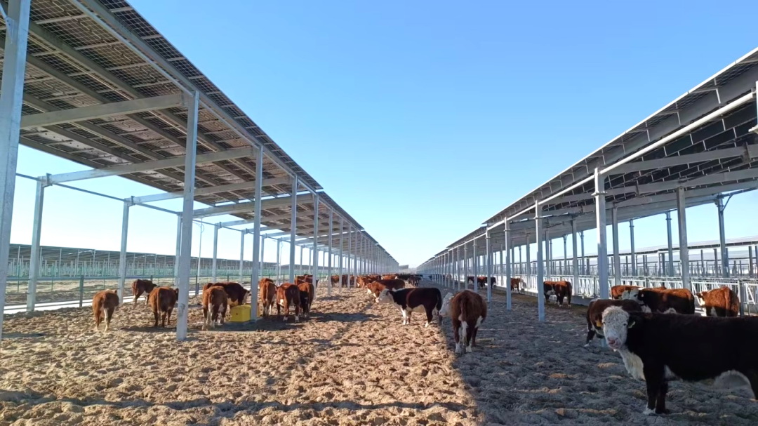 項目分三期建設,一期占地9380畝,建設內容包括育肥牛欄、動物保健中心、全混合日糧中心、升壓站及送出線路等設施。其中,育肥牛欄建設面積達150萬平方米,建成后,養(yǎng)殖規(guī)模可達存欄肉牛10萬頭、年出欄肉牛20萬頭,將成為亞洲最大的牧光融合產業(yè)集群。超級牧場內育肥牛舍屋頂光伏及草光互補區(qū)地面光伏兩部分組成,光伏總裝機容量398兆瓦。