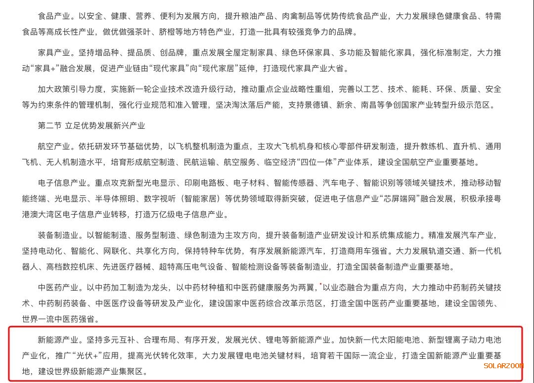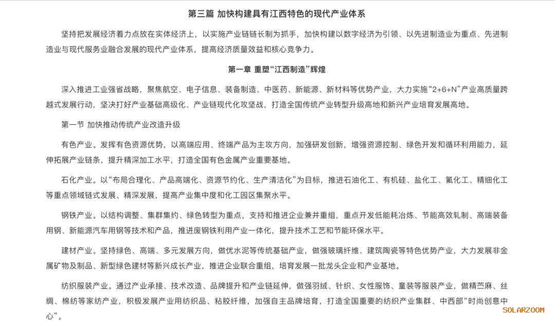 除發(fā)電端外,江西省在“十四五”期間,將加快新一代太陽能電池、新型鋰離子動力電池產(chǎn)業(yè)化,推廣“光伏+”應(yīng)用,提高光伏轉(zhuǎn)化效率,大力發(fā)展鋰電電池關(guān)鍵材料,培育若干國際一流企業(yè),打造全國新能源產(chǎn)業(yè)重要基地,建設(shè)世界級新能源產(chǎn)業(yè)集聚區(qū)。