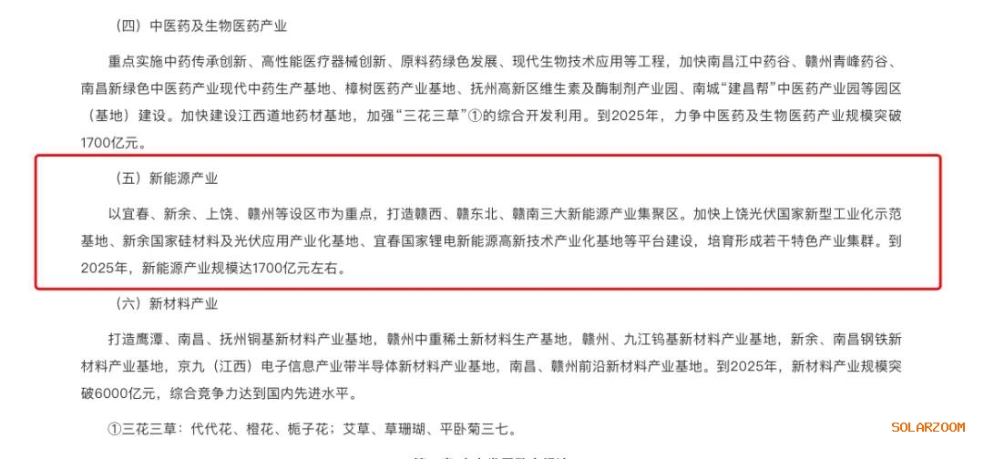 以宜春、新余、上饒、贛州等設(shè)區(qū)市為重點(diǎn),打造贛西、贛東北、贛南三大新能源產(chǎn)業(yè)集聚區(qū)。加快上饒光伏國家新型工業(yè)化示范基地、新余國家硅材料及光伏應(yīng)用產(chǎn)業(yè)化基地、宜春國家鋰電新能源高新技術(shù)產(chǎn)業(yè)化基地等平臺建設(shè),培育形成若干特色產(chǎn)業(yè)集群。到2025年,新能源產(chǎn)業(yè)規(guī)模達(dá)1700億元左右。