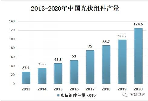 隨著中國光伏新增裝機容量不斷增加,中國光伏組件產量也不斷增加,2020年中國光伏組件產量達124.6GW,較2019年的98.6GW同比增長26.4%。
