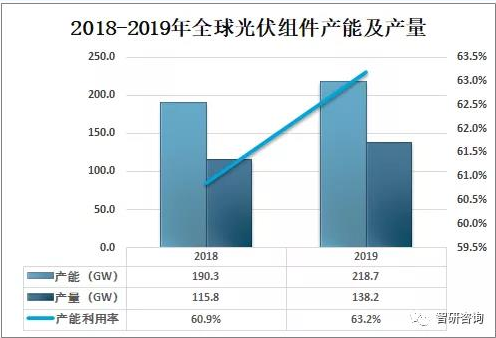 截止2019年全球光伏組件產能為218.7GW,較2018年同比增長14.9%;產量為138.2GW,較2018年同比增長19.3%,產能利用率為63.2%。