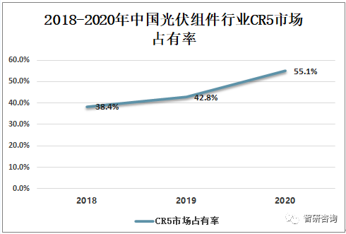 中國光伏組件行業(yè)市場集中度不斷提升,2020年中國光伏組件行業(yè)CR5市場占有率為55.1%,較2019年提高了12.3%。
