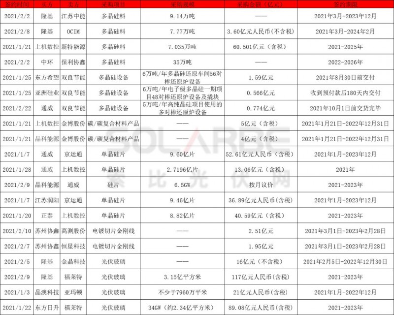 光伏玻璃方面,2021-2023年隆基與金晶科技、福萊特累計(jì)簽訂光伏玻璃采購超3.15億平方米,采購價(jià)格113億;晶澳科技未來兩年向亞瑪頓采購光伏玻璃不少于7960萬平米;東方日升將于2021-2023年向福萊特采購光伏玻璃34GW。