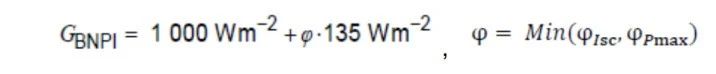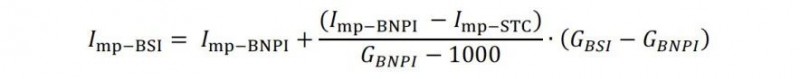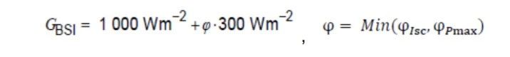 - 用于可靠性測試雙面輻照度 (BSI):用于雙面組件壓力測試注入的電流對應(yīng)的等效輻照度,相當(dāng)于1000W/m2照在組件正面加上300W/m2照在組件背面,測試方法參考IEC TS 60904-1-2。