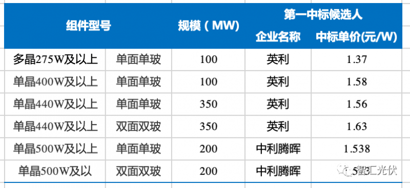 然而,根據(jù)評標(biāo)結(jié)果,實際多晶組件第一候選人價格為1.37元/W,單晶組件第一候選人價格在1.52~1.63元/W之間;因此,實際中標(biāo)價格可能遠低于最高報價。