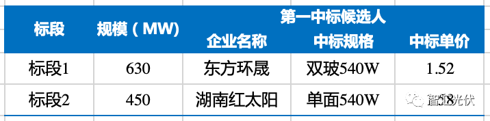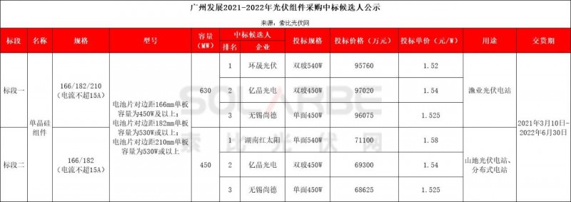 根據(jù)索比光伏網(wǎng)統(tǒng)計,廣州發(fā)展集采標(biāo)段一中標(biāo)候選人第一名為環(huán)晟光伏,投標(biāo)單價1.52元/W,且為最低投標(biāo)單價,組件投標(biāo)規(guī)格為雙玻540W;標(biāo)段二中標(biāo)候選人第一名為湖南紅太陽,投標(biāo)單價1.58元/W,組件投標(biāo)規(guī)格為單面540W。詳情請見下表: