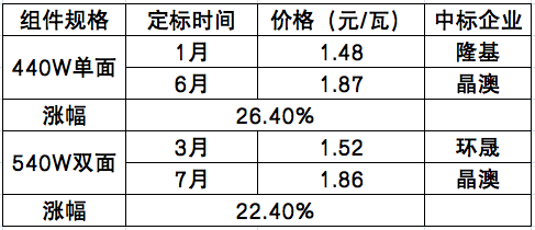 在價格方面,2021年上半年隨著組價集采的推進(jìn),組件價格受硅料上漲影響,其報價也呈現(xiàn)快速上漲的趨勢。從年初中核集團(tuán)第一批1.3GW組件集采,隆基單面450組件報出1.48/瓦元的中標(biāo)價格,到今年6月蒙能包頭50MW技術(shù)領(lǐng)跑項目中晶澳以450單面1.87元/瓦的中標(biāo)價格拿下上半年“標(biāo)王”,組件漲幅約26%左右。相較于去年1.55元/瓦的定標(biāo)均價而言,今年440+組件已經(jīng)來到1.7元/瓦上下;540雙面則由3月廣東電力第一批組件集采的1.52元/瓦的中標(biāo)價上漲至7月廣東電力第三批組件集采的1.86元/瓦中標(biāo)價格,漲幅約22.37%。