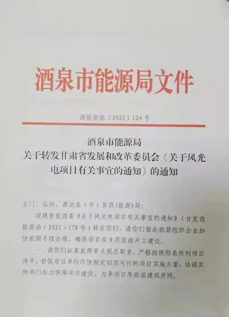 酒泉市2021年風、光建設規(guī)模為806MW,其中光伏756MW,風電50MW;
