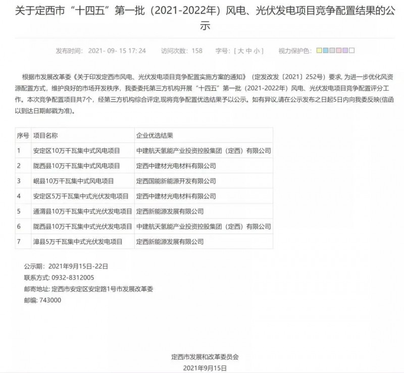 近日,甘肅定西市公布十四五”第一批(2021-2022年)風電、光伏發(fā)電項目競爭配置結果,根據(jù)文件,競爭配置風電、光伏發(fā)電項目7個,建設總規(guī)模600MW。其中,風電項目3個、建設規(guī)模300MW,光伏發(fā)電項目4個、建設規(guī)模為300MW。競爭配置風電、光伏發(fā)電項目配置儲能容量不低于風電、光伏發(fā)電項目配置容量的5%,配置風電、光伏發(fā)電項目與儲能設施必須于2022年11月底前全容量建成投產(chǎn)。其中,風電項目必須于2021年12月底前開工建設,光伏發(fā)電項目必須于2021年12月底前實現(xiàn)一半以上并網(wǎng)規(guī)模。