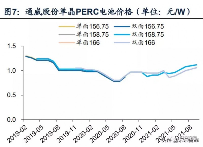 單雙面電池/組件幾乎同價,雙面增益滲透率不斷提升。根據(jù)Wind,通威股份PERC單雙面電池片報價已趨于一致。根據(jù)Solarzoom,一線廠商單雙面組件成交價差也在0.02元/W以內(nèi)。由于雙面組件背面發(fā)電增益帶來的性價比提升,滲透率正在快速提升,根據(jù)CPIA統(tǒng)計,雙面組件市場份額已從2018年的2%提升至2020年的30%,預(yù)計2025年有望達(dá)到60%以上。