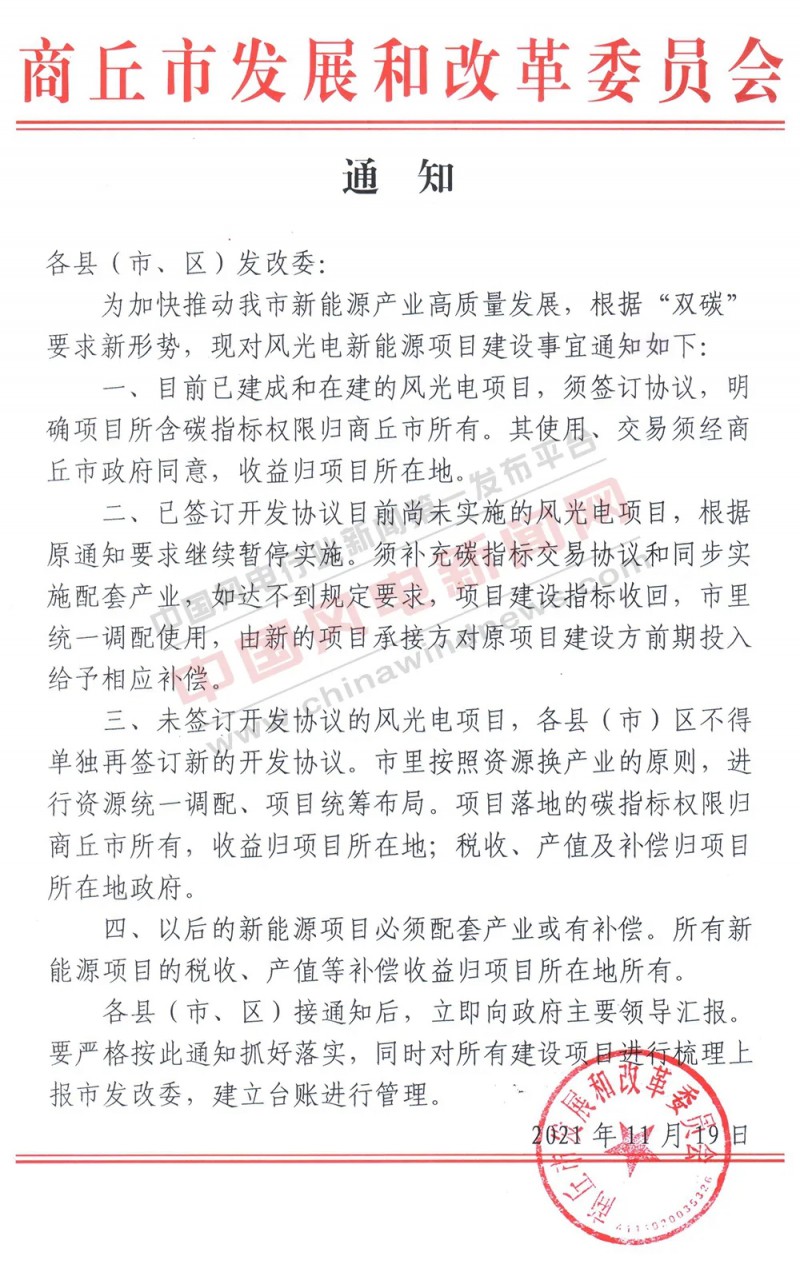 11月19日,商丘市發(fā)改委下發(fā)關于風電光伏項目建設通知,通知要求: