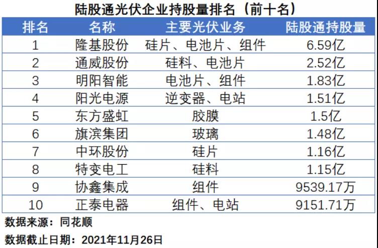 在陸股通持股量排名中,截止到11月26日收盤(下同),隆基股份憑借自身超強(qiáng)的綜合實力以及較高的總股本規(guī)模最受“北向資金”的青睞,以6.59億的持股量位居第一,通威股份和明陽智能分別以2.52億和1.83億位居第二和第三。陽光電源、東方盛虹、旗濱集團(tuán)、中環(huán)股份、特變電工的持股量均在1億股以上。在前十名中,共有4家企業(yè)涉足組件業(yè)務(wù),3家企業(yè)涉足電池片業(yè)務(wù),涉足硅料、硅片業(yè)務(wù)的企業(yè)各有2家。
