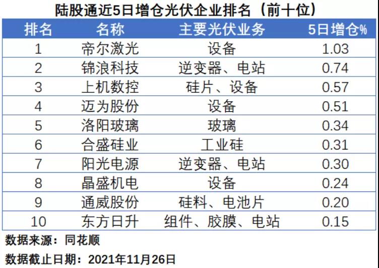 在陸股通近60日增倉排名中,邁為股份、陽光電源和晶盛機(jī)電分居前三位,增倉幅度分別為5.17%、2.51%和1.61%,其中邁為股份和晶盛機(jī)電均為光伏設(shè)備企業(yè),前者的核心產(chǎn)品為太陽能電池絲網(wǎng)印刷生產(chǎn)設(shè)備,后者主營產(chǎn)品為晶體生長設(shè)備。上機(jī)數(shù)控、東方日升、錦浪科技、合盛硅業(yè)、帝爾激光、東方盛虹和特變電工分居第四到第十位。前十名中,涉足光伏設(shè)備業(yè)務(wù)的企業(yè)高達(dá)4家,涉足電站業(yè)務(wù)的企業(yè)為3家。