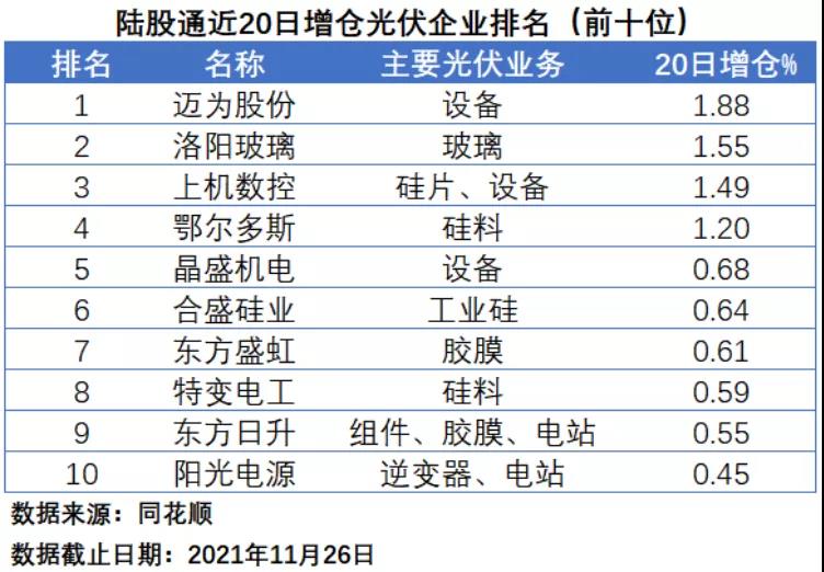 在陸股通近20日增倉排名中,邁為股份、洛陽玻璃和上機(jī)數(shù)控位居前三位,增持幅度分別為1.88%、1.55%和1.45%,值得一提的是,洛陽玻璃于11月26日正式發(fā)布了產(chǎn)能擴(kuò)建計劃,未來公司在光伏玻璃領(lǐng)域的市場地位將進(jìn)一步得到鞏固;上機(jī)數(shù)控此前三季報業(yè)績不及預(yù)期,股價大跌,而“北向資金”則選擇了逆勢抄底。排名第四到第十位的企業(yè)分別為鄂爾多斯、晶盛機(jī)電、合盛硅業(yè)、東方盛虹、特變電工、東方日升和陽光電源。