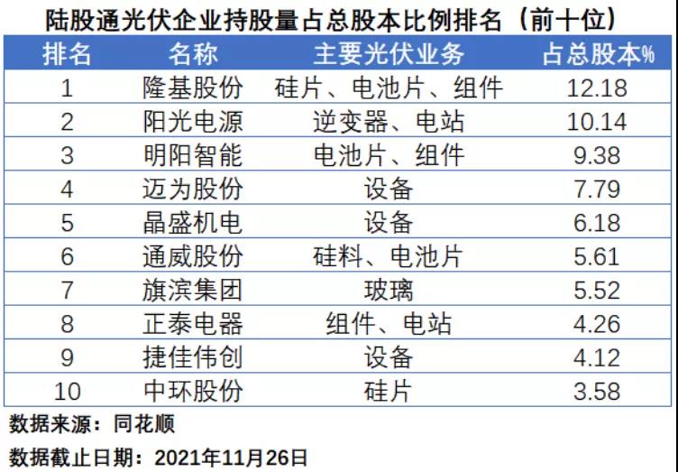在陸股通持股量占總股本比例排名中,隆基股份以12.18%排名第一,陽光電源和明陽智能分別以10.14%和9.38%分居第二和第三位,邁為股份、晶盛機(jī)電、通威股份、旗濱集團(tuán)、正泰電器、捷佳偉創(chuàng)和中環(huán)股份位居第四到第十位。值得注意的是,前十名中,光伏設(shè)備企業(yè)的數(shù)量達(dá)到3家,占比最高。在如今光伏行業(yè)產(chǎn)能規(guī)模持續(xù)提升、個別環(huán)節(jié)的技術(shù)路線仍存一定變數(shù)的情況下,景氣度較高的光伏設(shè)備領(lǐng)域頗受“北向資金”青睞。