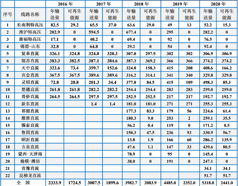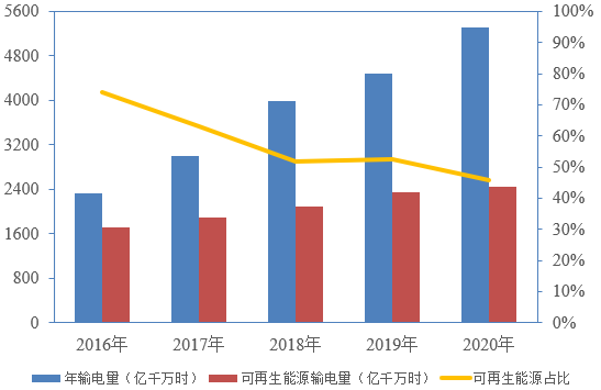 “十三五”期間,我國特高壓工程建設(shè)進(jìn)展迅速,特高壓線路輸送電量和輸送可再生能源電量逐年增加,“西電東送”工程穩(wěn)步向前,但輸送可再生能源電量的比重反而在下降,2020年我國22條特高壓輸送通道平均可再生能源占比為46%,創(chuàng)下近五年新低。2021年10月24日,國務(wù)院印發(fā)的《2030年前碳達(dá)峰行動(dòng)方案》提出“嚴(yán)控跨區(qū)外送可再生能源電力配套煤電規(guī)模,新建通道可再生能源電量比例原則上不低于50%。”可以預(yù)見,隨著全社會(huì)對(duì)碳達(dá)峰、碳中和目標(biāo)形成共識(shí)以及國家政策引導(dǎo),清潔能源占比將持續(xù)提升。