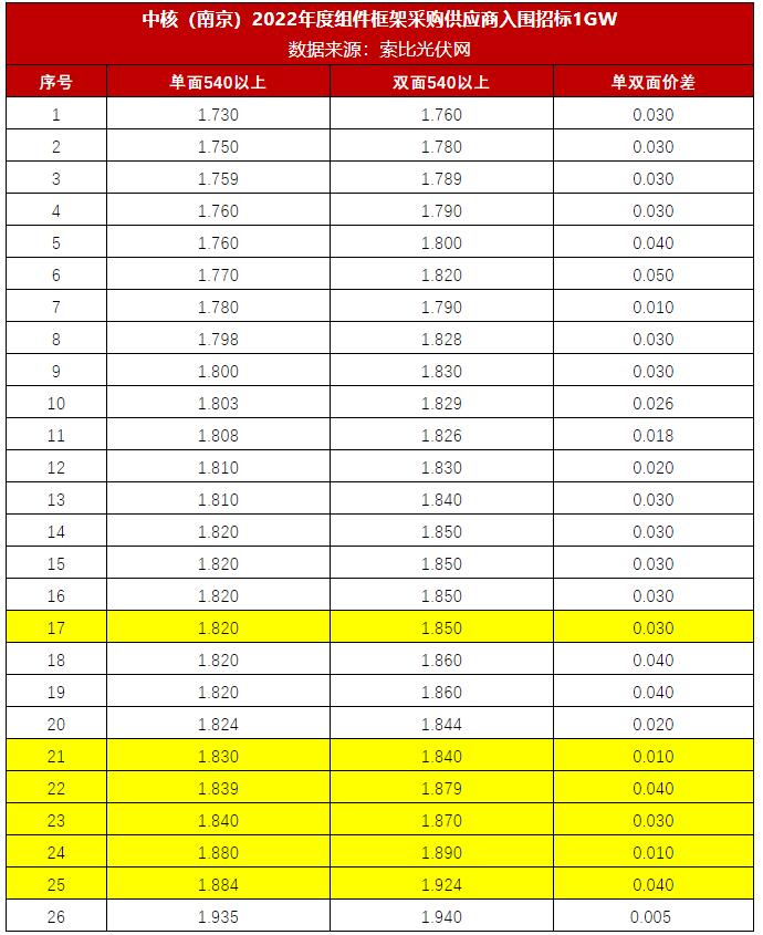 1月19日,中核(南京)2022年度1GW光伏組件框架采購供應(yīng)商入圍招標(biāo)正式開標(biāo)。索比光伏網(wǎng)獲悉,本次共26家企業(yè)提供報價,單面組件最低報價1.73元/W,最高報價1.935元/W,平均1.811元/W。雙面組件最低報價1.76元/W,最高報價1.94元/W,平均1.839元/W。多數(shù)企業(yè)單、雙面價差在0.03元/W左右。