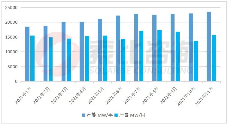 2021年底中國硅料總產能78萬噸,硅料總產量達48.78萬噸,預計2022年底硅料總產能達115萬噸,但2022年H1硅料仍持相對緊缺的狀態(tài),下半年或有緩解。
