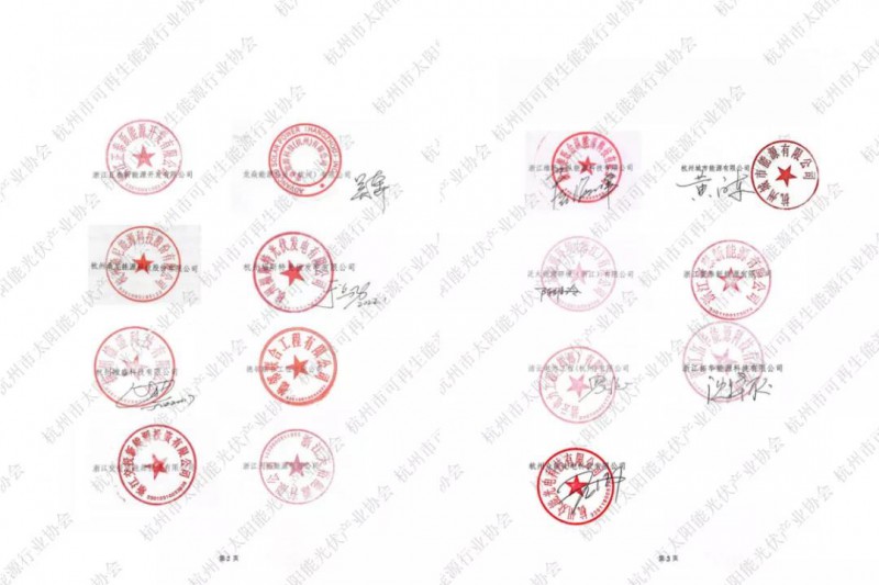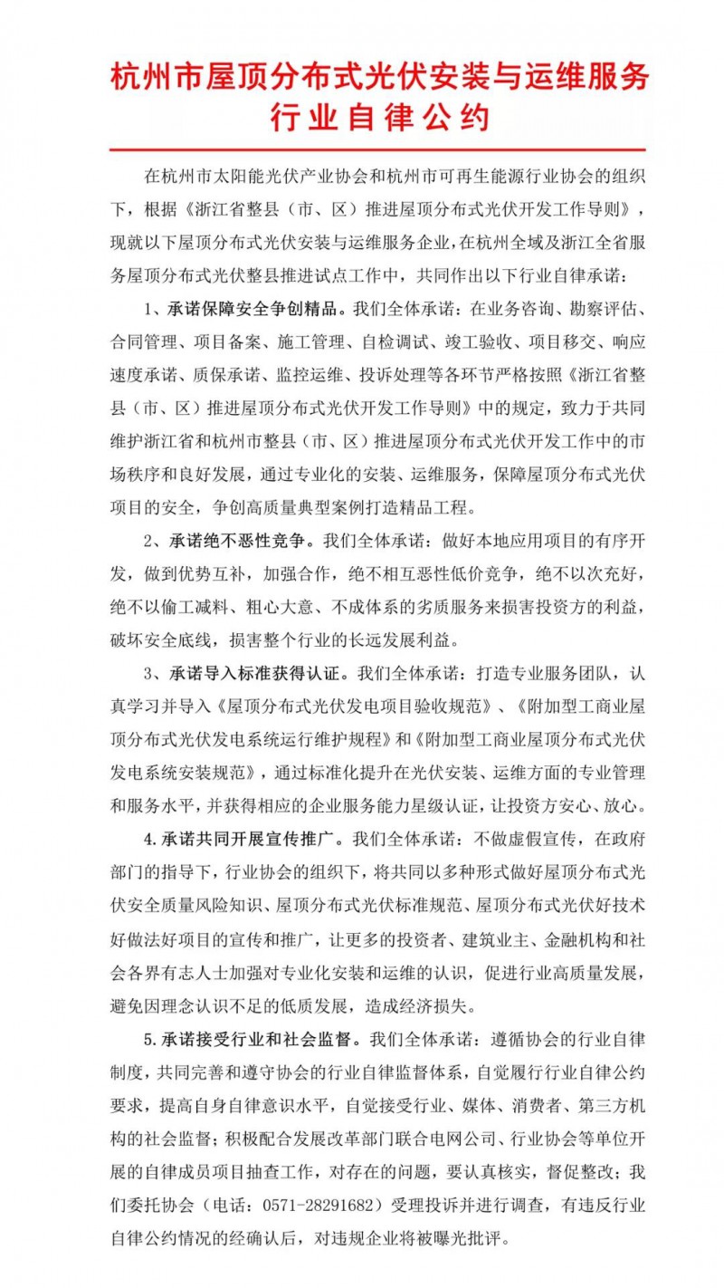 為踐行該《導(dǎo)則》在杭州全域及浙江全省的推廣應(yīng)用,在杭州市太陽能光伏產(chǎn)業(yè)協(xié)會和杭州市可再生能源行業(yè)協(xié)會的組織下,浙江正泰新能源開發(fā)有限公司、龍焱能源科技(杭州)有限公司、杭州桑尼能源科技股份有限公司、杭州福斯特光伏發(fā)電有限公司、杭州帷盛科技有限公司、德鄰聯(lián)合工程有限公司、浙江交投新能源投資有限公司、浙江天裕能源有限公司、浙江維旺合縱能源科技有限公司、杭州城市能源有限公司、泛太能源環(huán)境(浙江)有限公司、浙江寰泰新能源有限公司、浙江拓華能源科技有限公司、潔云電力工程(杭州)有限公司、杭州眾能光電科技有限公司共十五家光伏企業(yè),根據(jù)《導(dǎo)則》條款,聯(lián)合簽署了《杭州市屋頂分布式光伏安裝與運維服務(wù)行業(yè)自律公約》,帶頭向社會公開承諾加強(qiáng)行業(yè)自律,共同維護(hù)浙江省和杭州市整縣(市、區(qū))推進(jìn)屋頂分布式光伏開發(fā)工作中的市場秩序和良好發(fā)展。