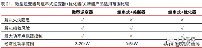微型逆變器是小型、組件級分布式發(fā)電系統(tǒng)電能轉(zhuǎn)換的最佳方案。“組件級電力電子” 解決方案除了包括微型逆變器,還有“組串式逆變器+優(yōu)化器/關(guān)斷器”的方案。優(yōu)化器或 關(guān)斷器可為光伏系統(tǒng)提供組件級的關(guān)斷能力,在特定場景下保證光伏系統(tǒng)直流電壓不超過 80V,且優(yōu)化器亦可實現(xiàn)組件級的最大功率點(diǎn)跟蹤控制;但在運(yùn)行過程中系統(tǒng)仍存在直流 高壓,有一定的安全隱患。組串式逆變器+優(yōu)化器/關(guān)斷器在較大功率的應(yīng)用場景中有一定 的成本優(yōu)勢,但微型逆變器在中小功率等級的應(yīng)用場景中更優(yōu)。