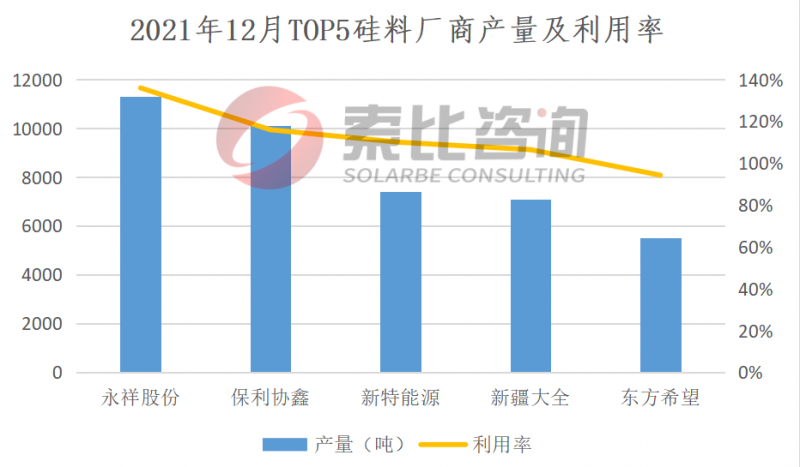2021年12月,國(guó)內(nèi)12家多晶硅企業(yè)在產(chǎn),兩家企業(yè)擴(kuò)產(chǎn)量逐步釋放,產(chǎn)量再創(chuàng)新高。連續(xù)兩周成交清淡,導(dǎo)致部分硅料企業(yè)有少量庫(kù)存積壓。12月份國(guó)內(nèi)多晶硅產(chǎn)量為4.88萬噸(約19.28GW),環(huán)比增長(zhǎng)15.9%。按照產(chǎn)量排名,永祥、協(xié)鑫、新特、大全、東方希望位列前五,企業(yè)總產(chǎn)量4.14萬噸,占比84.8%,綜合利用率112.6%。索比咨詢預(yù)期1月份硅料產(chǎn)量小幅上漲。從供應(yīng)端來看,12月份協(xié)鑫顆粒硅及新疆大全擴(kuò)產(chǎn)產(chǎn)能有少量釋放。從需求端來看,終端采購(gòu)力度有所回暖,開工率上升。