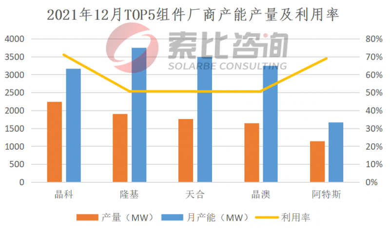 2021年12月,終端需求小幅上升,因此本月組件產(chǎn)量比上月也有小幅上漲。國(guó)內(nèi)組件產(chǎn)量16GW,環(huán)比增長(zhǎng)2.23%。按照產(chǎn)量排名,晶科、隆基、天合、晶澳、阿特斯位列前五,企業(yè)總產(chǎn)量8.72GW,占比54.5%,綜合開工率58.41%。預(yù)計(jì)2022年1月,終端需求持續(xù)回暖,國(guó)內(nèi)2022年各企業(yè)集采招標(biāo)已陸續(xù)啟動(dòng),組件需求及價(jià)格都將小幅上漲。