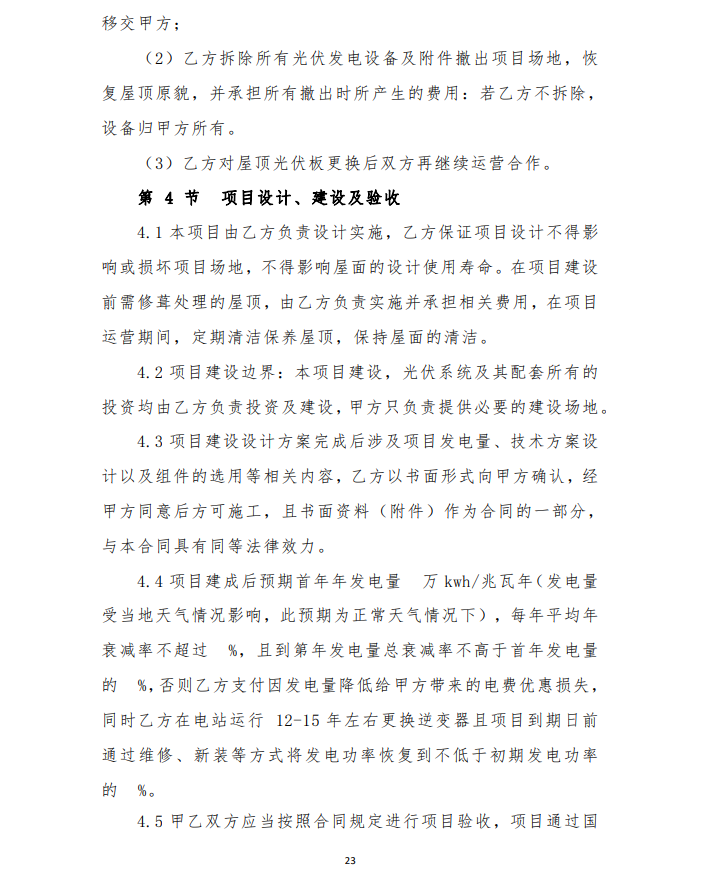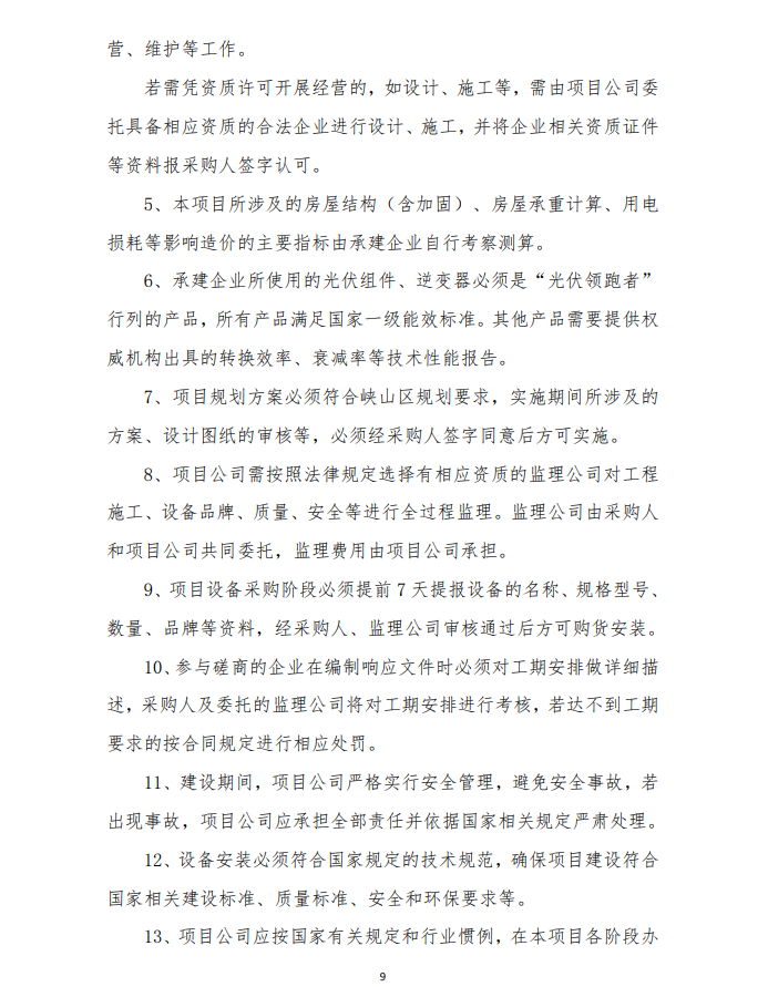 4、由于光伏發(fā)電項(xiàng)目運(yùn)行生命周期長(zhǎng),安裝用戶點(diǎn)多,面大,為保障安裝戶的權(quán)益,維護(hù)社會(huì)穩(wěn)定,建設(shè)企業(yè)要提供明確的長(zhǎng)期運(yùn)維方案及保障費(fèi)用,具體以運(yùn)維合同為準(zhǔn)。
