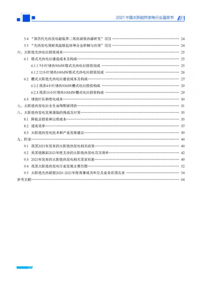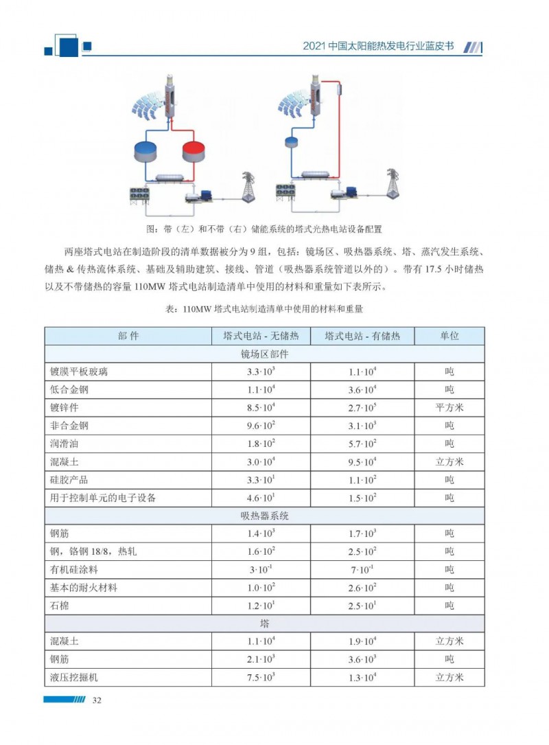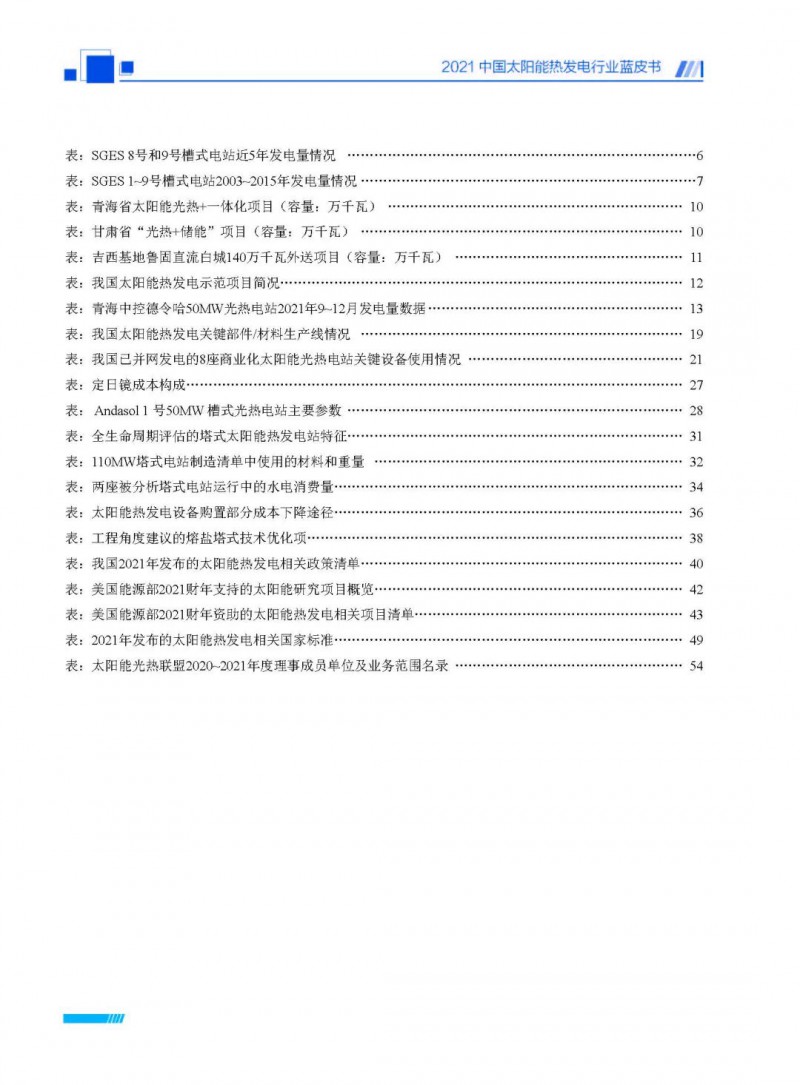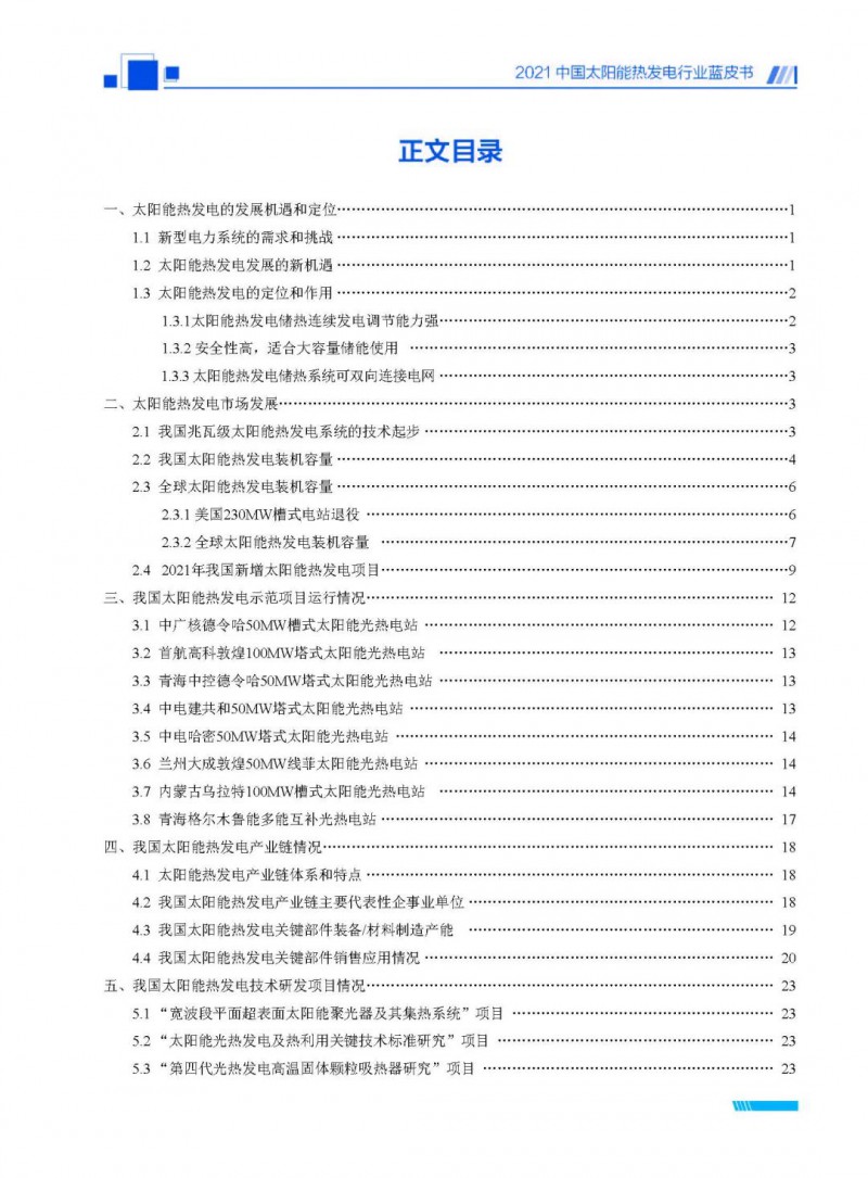 2021中國太陽能熱發(fā)電行業(yè)藍(lán)皮書(以下簡稱“藍(lán)皮書”)共分為9個章節(jié),分別為:太陽能熱發(fā)電的發(fā)展機遇和定位、太陽能熱發(fā)電市場發(fā)展、我國太陽能熱發(fā)電示范項目運行情況、我國太陽能熱發(fā)電產(chǎn)業(yè)鏈情況、我國太陽能熱發(fā)電研發(fā)項目情況、太陽能熱發(fā)電投資成本、太陽能熱發(fā)電站全生命周期碳排放、太陽能熱發(fā)電發(fā)展面臨的挑戰(zhàn)及對策,以及附錄。附錄主要包括:我國2021年發(fā)布的太陽能熱發(fā)電項目政策、美國能源部2021年度支持的太陽能熱發(fā)電項目清單、2021年發(fā)布的太陽能熱發(fā)電相關(guān)國家標(biāo)準(zhǔn)、我國太陽能熱發(fā)電行業(yè)發(fā)展主要歷程、太陽能光熱聯(lián)盟理事成員單位及業(yè)務(wù)范圍名錄。全文4.5萬+字,共55張圖表。