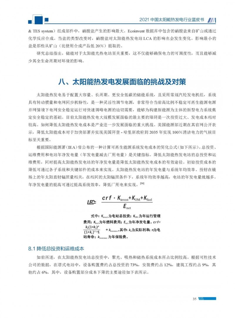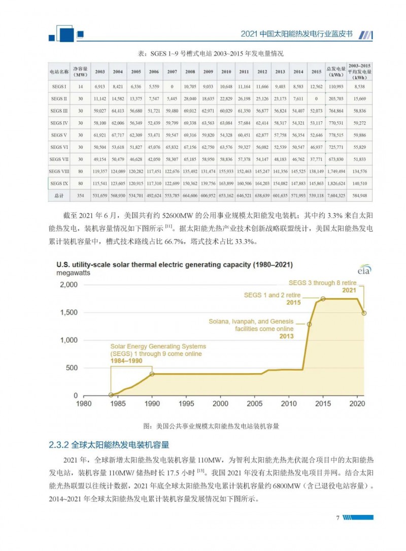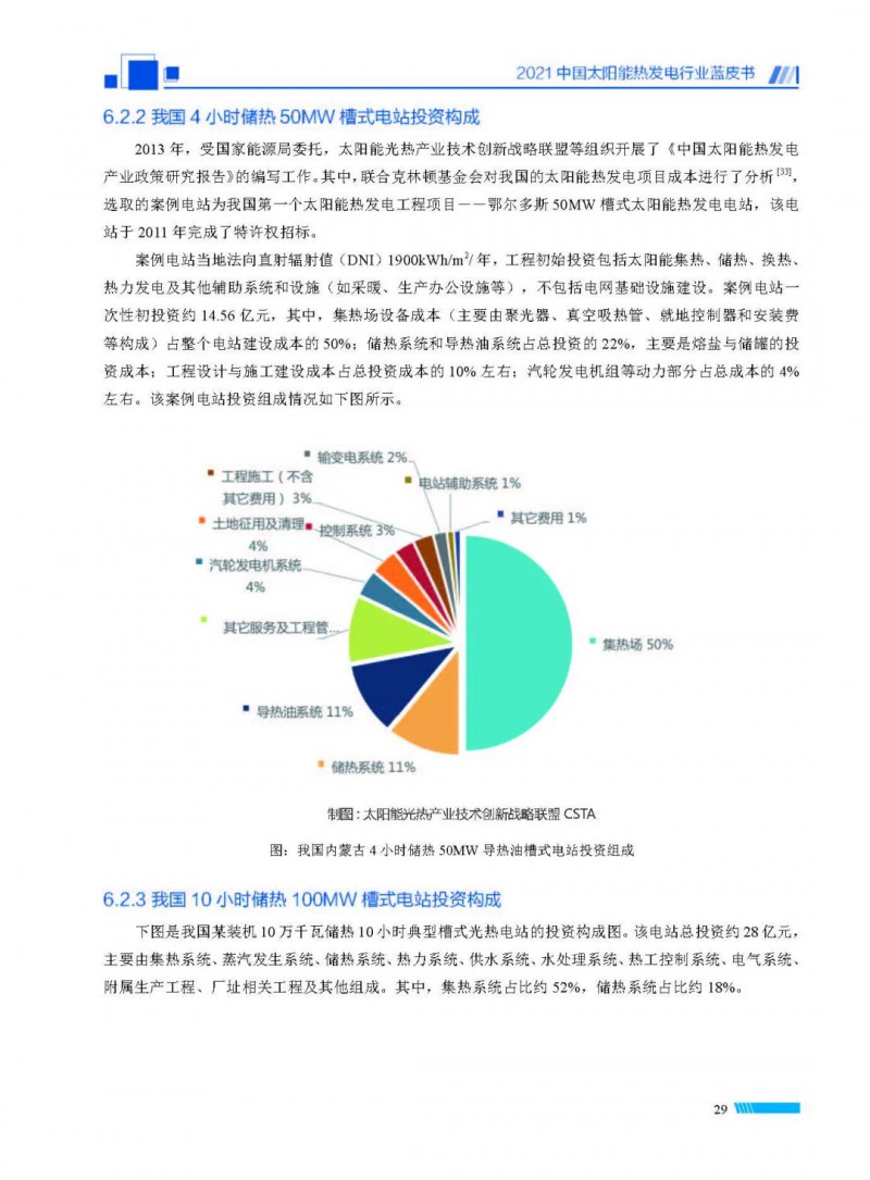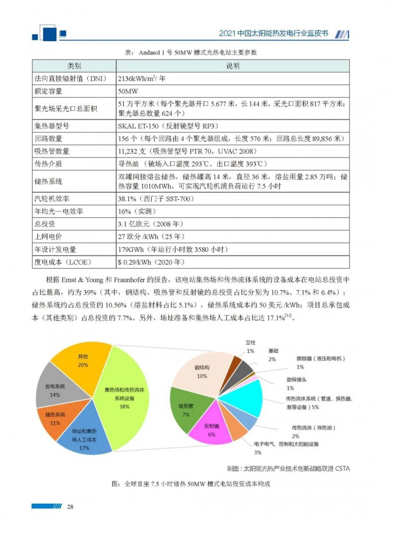 2021中國太陽能熱發(fā)電行業(yè)藍(lán)皮書(以下簡稱“藍(lán)皮書”)共分為9個章節(jié),分別為:太陽能熱發(fā)電的發(fā)展機遇和定位、太陽能熱發(fā)電市場發(fā)展、我國太陽能熱發(fā)電示范項目運行情況、我國太陽能熱發(fā)電產(chǎn)業(yè)鏈情況、我國太陽能熱發(fā)電研發(fā)項目情況、太陽能熱發(fā)電投資成本、太陽能熱發(fā)電站全生命周期碳排放、太陽能熱發(fā)電發(fā)展面臨的挑戰(zhàn)及對策,以及附錄。附錄主要包括:我國2021年發(fā)布的太陽能熱發(fā)電項目政策、美國能源部2021年度支持的太陽能熱發(fā)電項目清單、2021年發(fā)布的太陽能熱發(fā)電相關(guān)國家標(biāo)準(zhǔn)、我國太陽能熱發(fā)電行業(yè)發(fā)展主要歷程、太陽能光熱聯(lián)盟理事成員單位及業(yè)務(wù)范圍名錄。全文4.5萬+字,共55張圖表。