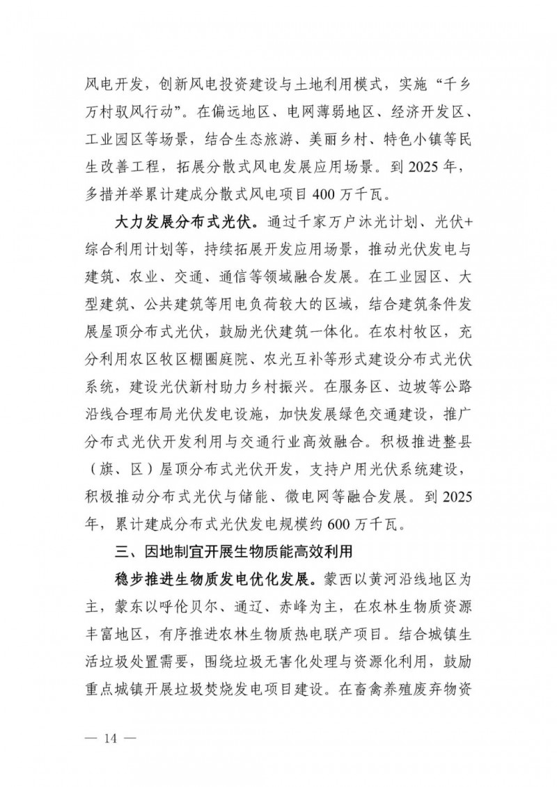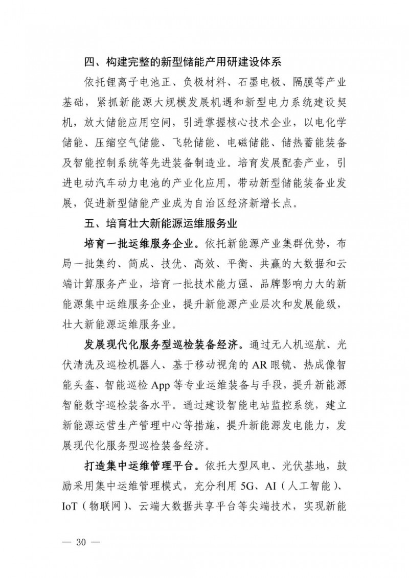 可再生能源發(fā)電目標(biāo)。自治區(qū)可再生能源發(fā)電裝機(jī)達(dá)到 1.35 億千瓦以上,其中風(fēng)電 8900 萬(wàn)千瓦、光伏發(fā)電 4500 萬(wàn)千瓦,新能源裝機(jī)規(guī)模超過(guò)燃煤火電裝機(jī)規(guī)模,新能源發(fā)電量占自治區(qū)總發(fā)電量比重超過(guò)35%。“十四五”期間可再生能源新增裝機(jī) 8000 萬(wàn)千瓦以上,占全部新增裝機(jī)的比重超過(guò) 60%,成為新增裝機(jī)的主力。