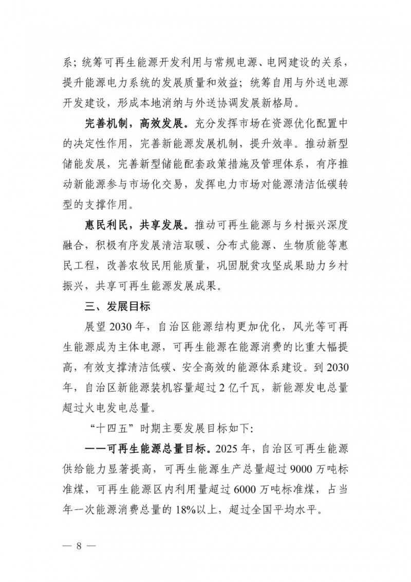可再生能源總量目標(biāo)。至2025 年,自治區(qū)可再生能源生產(chǎn)總量超過(guò) 9000萬(wàn)噸標(biāo)準(zhǔn)煤,可再生能源區(qū)內(nèi)利用量超過(guò)6000萬(wàn)噸標(biāo)準(zhǔn)煤,占當(dāng)年一次能源消費(fèi)總量的18%以上,超過(guò)全國(guó)平均水平。