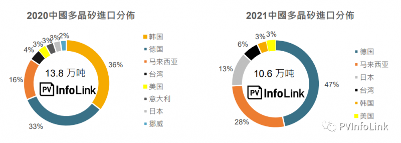 2021年進(jìn)口多晶硅主要來自德國和馬來西亞,兩者占比達(dá)到了75%,主因兩國擁有瓦克和OCI兩家目前生產(chǎn)較為穩(wěn)定的非中國廠家。與2020年比較,出口多晶硅到中國的國家數(shù)量減少,且過去占據(jù)進(jìn)口量第一名的韓國占比快速縮小,在韓國國內(nèi)生產(chǎn)設(shè)施目前沒有重啟的意愿下,預(yù)期未來占比將趨近于0%。其他來自日本或是臺(tái)灣的多晶硅進(jìn)口,因該地區(qū)沒有多晶硅生產(chǎn)設(shè)施,可能是過去所簽訂的多晶硅長(zhǎng)單未完全使用而轉(zhuǎn)售,但也僅有小量的占比。