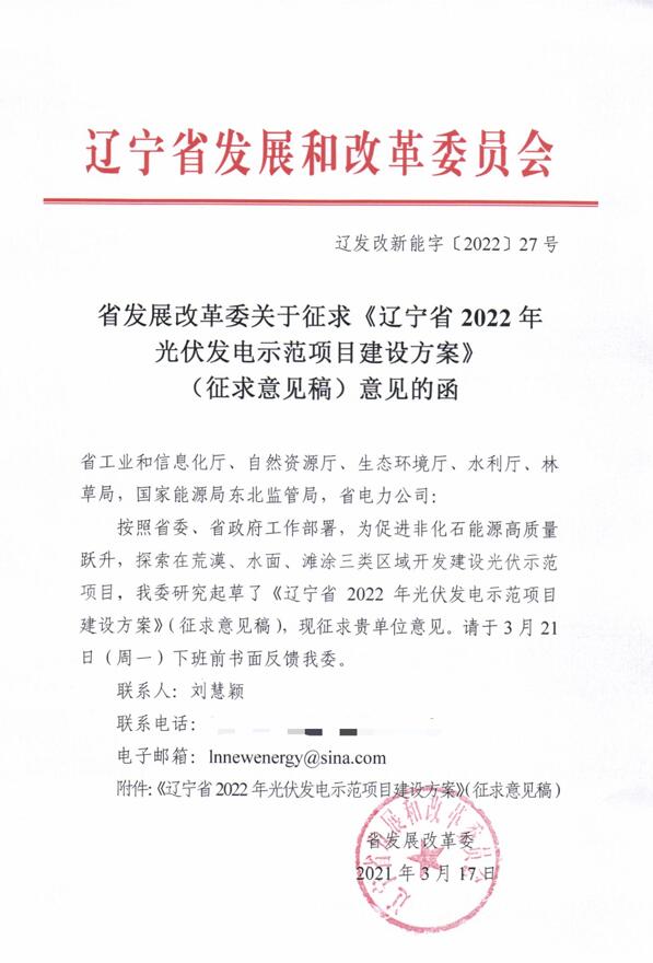 原標題:關于征求《遼寧省2022年光伏發(fā)電示范項目建設方案》(征求意見稿)意見的函