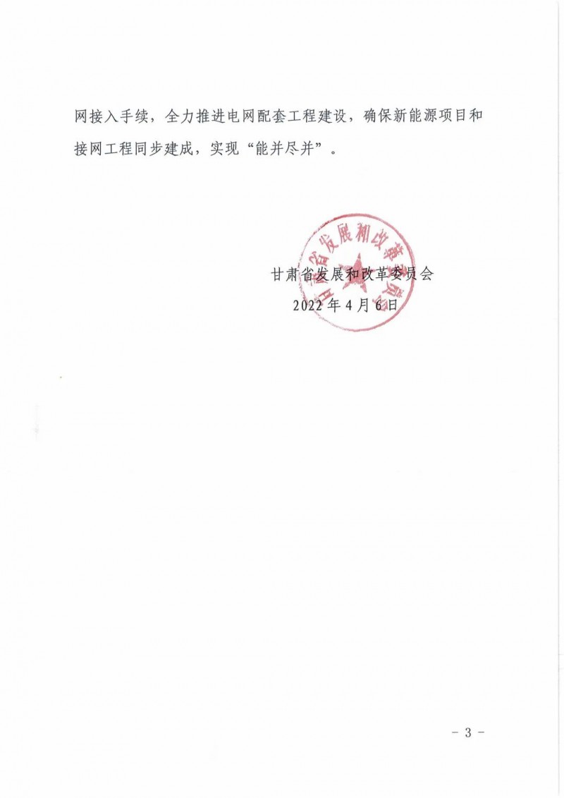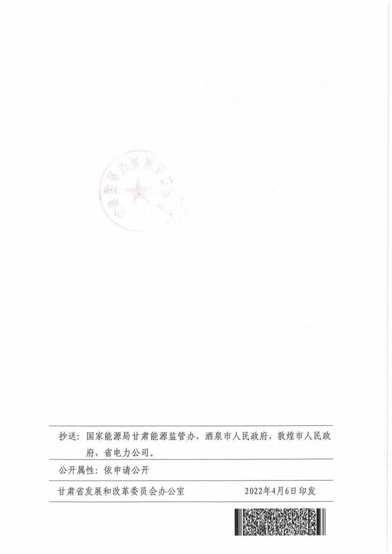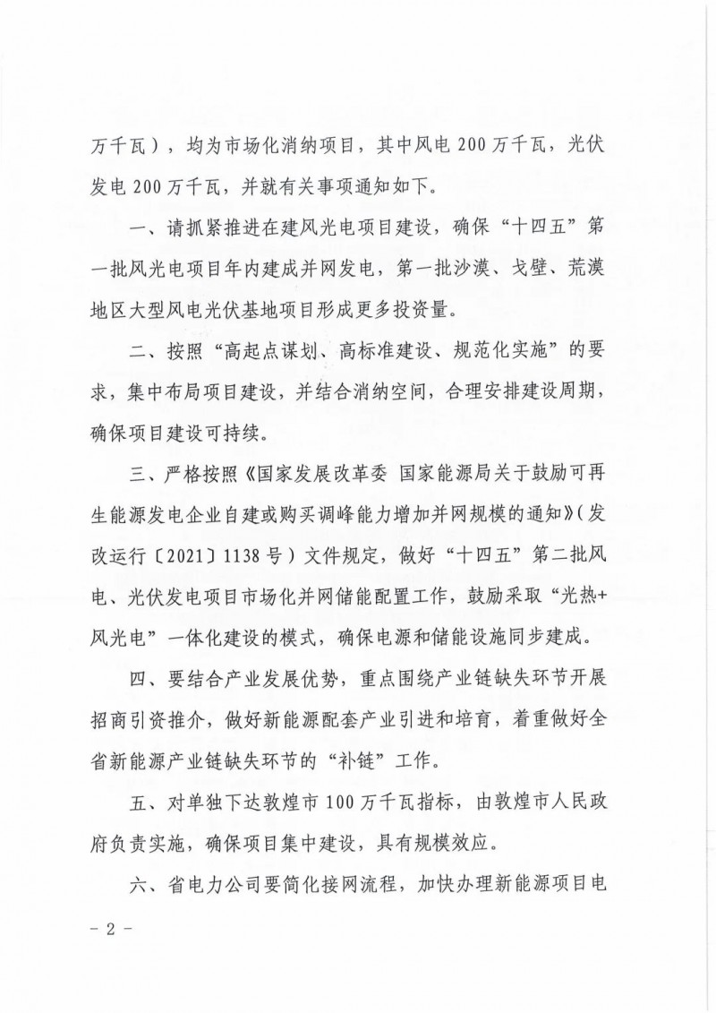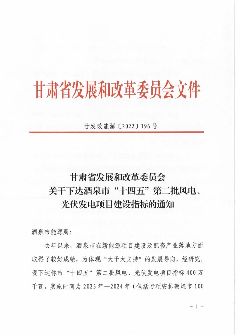 4月6日,甘肅省發(fā)展和改革委員會下發(fā)《關(guān)于下達(dá)酒泉市“十四五”第二批風(fēng)電、光伏發(fā)電項目建設(shè)指標(biāo)的通知》(甘發(fā)改能源〔2022)196號)?!锻ㄖ诽岢鼍迫?quot;十四五"第二批風(fēng)電、光伏發(fā)電項目指標(biāo)為400萬千瓦,實施時間為2023-2024年(包括專項安排敦煌市100萬千瓦),均為市場化消納項目,其中風(fēng)電200萬千瓦,光伏發(fā)電200萬千萬。