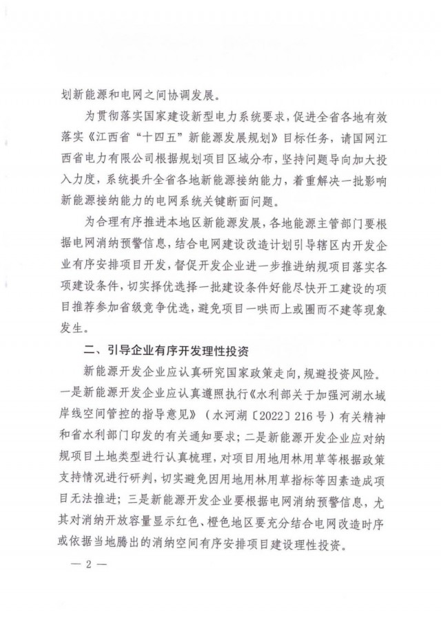 文件強(qiáng)調(diào),新能源開(kāi)發(fā)企業(yè)應(yīng)認(rèn)真遵照?qǐng)?zhí)行《水利部關(guān)于加強(qiáng)河湖水域岸線空間管控的指導(dǎo)意見(jiàn)》(水河湖〔2022〕216號(hào))有關(guān)精神和省水利部門(mén)印發(fā)的有關(guān)通知要求;二是新能源開(kāi)發(fā)企業(yè)應(yīng)對(duì)納規(guī)項(xiàng)目土地類型進(jìn)行認(rèn)真梳理,對(duì)項(xiàng)目用地用林用草等根據(jù)政策支持情況進(jìn)行研判,切實(shí)避免因用地用林用草指標(biāo)等因素造成項(xiàng)目無(wú)法推進(jìn);三是新能源開(kāi)發(fā)企業(yè)要根據(jù)電網(wǎng)消納預(yù)警信息,尤其對(duì)消納開(kāi)放容量顯示紅色、橙色地區(qū)要充分結(jié)合電網(wǎng)改造時(shí)序或依據(jù)當(dāng)?shù)仳v出的消納空間有序安排項(xiàng)目建設(shè)理性投資。
